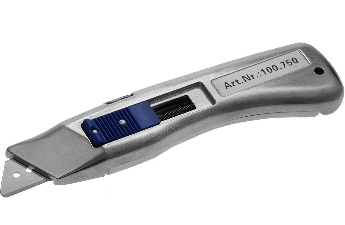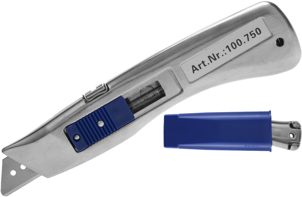Onverwoestbare aluminium meshouder. Dit Delhin veiligheidsmes is bij uitstek geschikt voor het snijden van verpakkingsmateriaal, dakleer, tapijten, dik karton, PVC-vloeren, PVC folie en soortgelijke materialen.