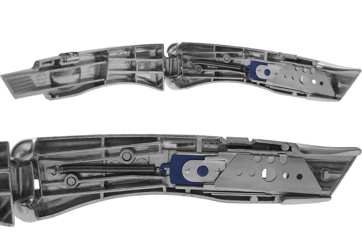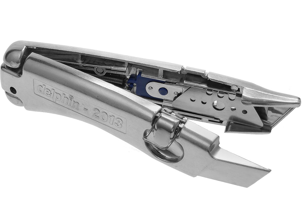 Door het volautomatisch mes terug-veer-systeem is het een extra veilig Delphin mes. Aan de binnenzijde kunnen reservemessen opgeborgen worden, deze worden stevig vastgehouden door twee magneten.