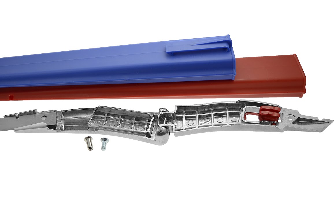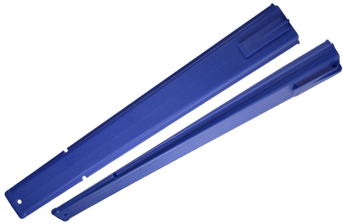 Geleverd met getoonde meshouder en in een stevige veiligheidskoker van 43,5cm lang, verkrijgbaar in rood en blauw.
