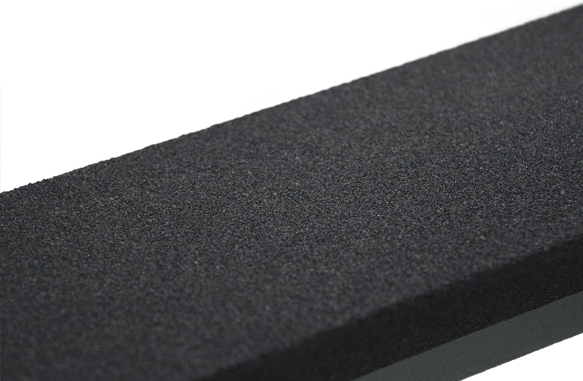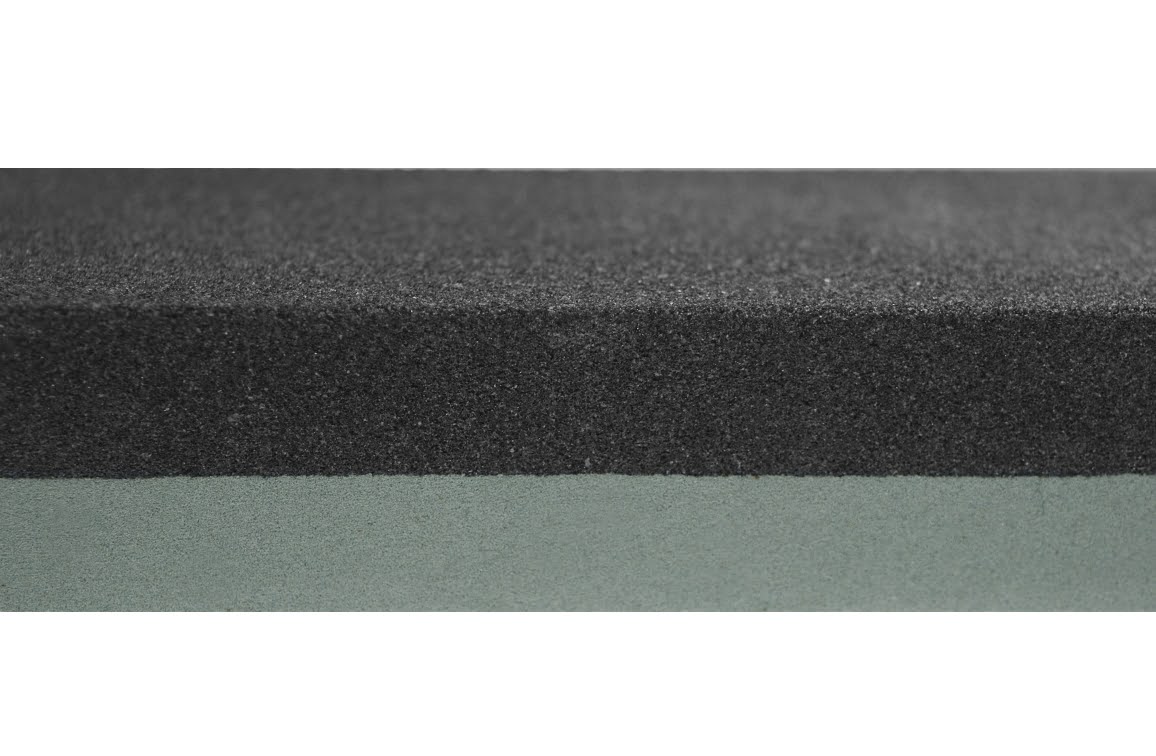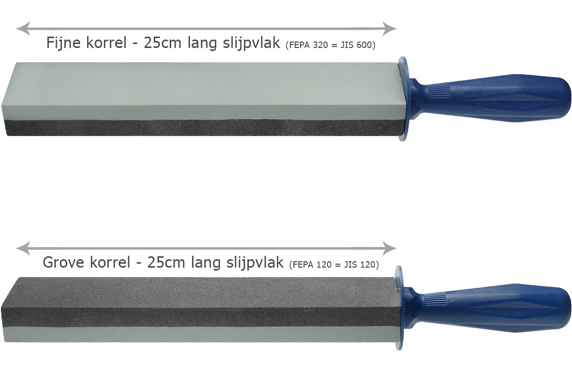 De groene zijde is bedoeld voor het fijn slijpen van uw mes en heeft een zéér fijne korrel, deze zijde voldoet aan de specificatie FEPA 320 = JIS 600. De zwarte zijde is voorzien van een grove korrel voor het verwijderen van schade en het grof slijpen van uw mes, deze zijde voldoet aan de specificatie FEPA 120 = JIS 120.