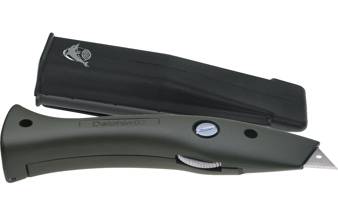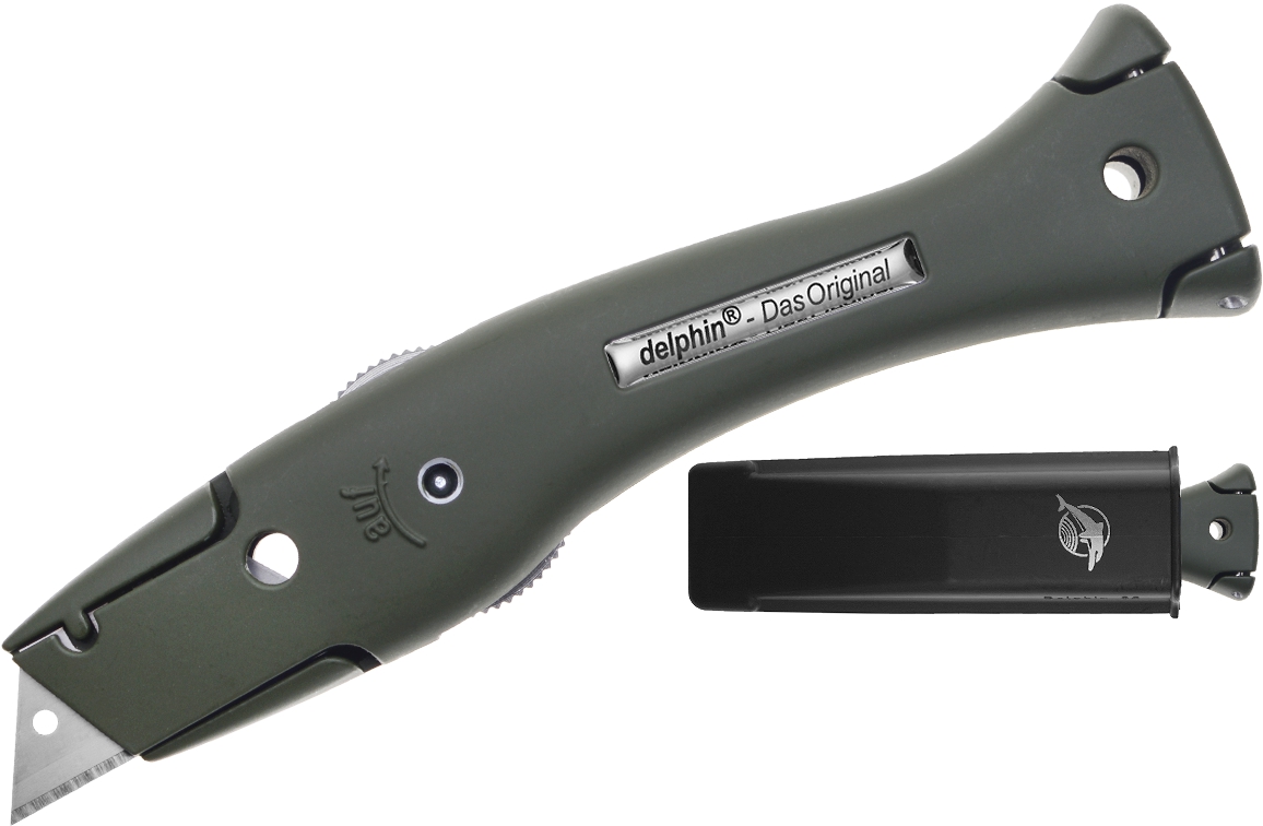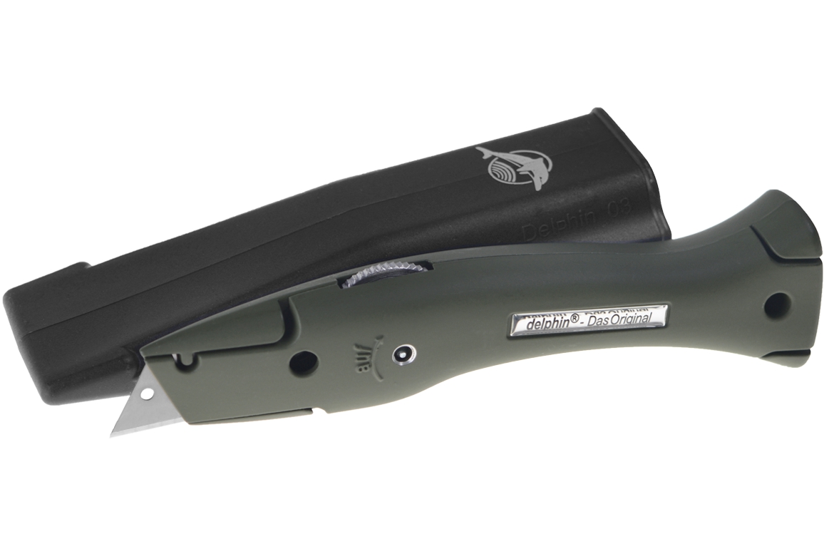 Aan de binnenzijde van dit Delphin mes is ruimte voor het opbergen van 10 reservemessen. Het lemmet kan op 3 verschillende posities geplaatst worden in de meshouder. Het verwisselen van messen gaat simpel dankzij de magneet in de neus van de meshouder.