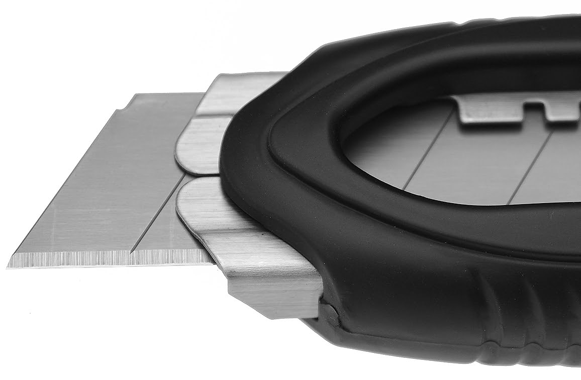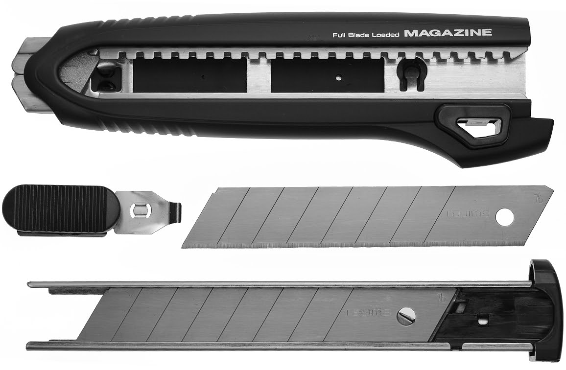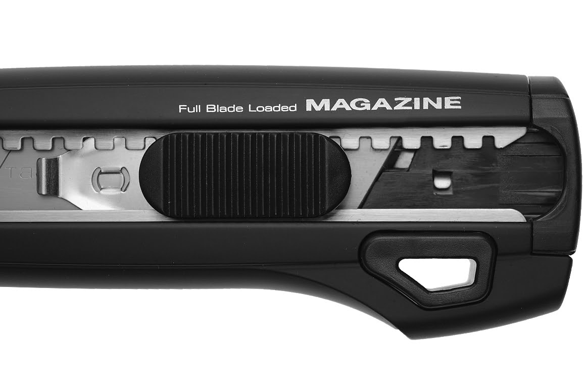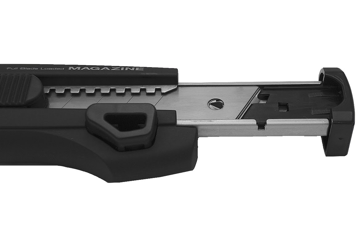 Een buitengewoon robuust 18mm afbreekmes. Het afbreekmes is uitgerust met een cartridge waarin 6 reservemessen opgeslagen kunnen worden. Nadat een mes op is wordt het mes automatisch vervangen.