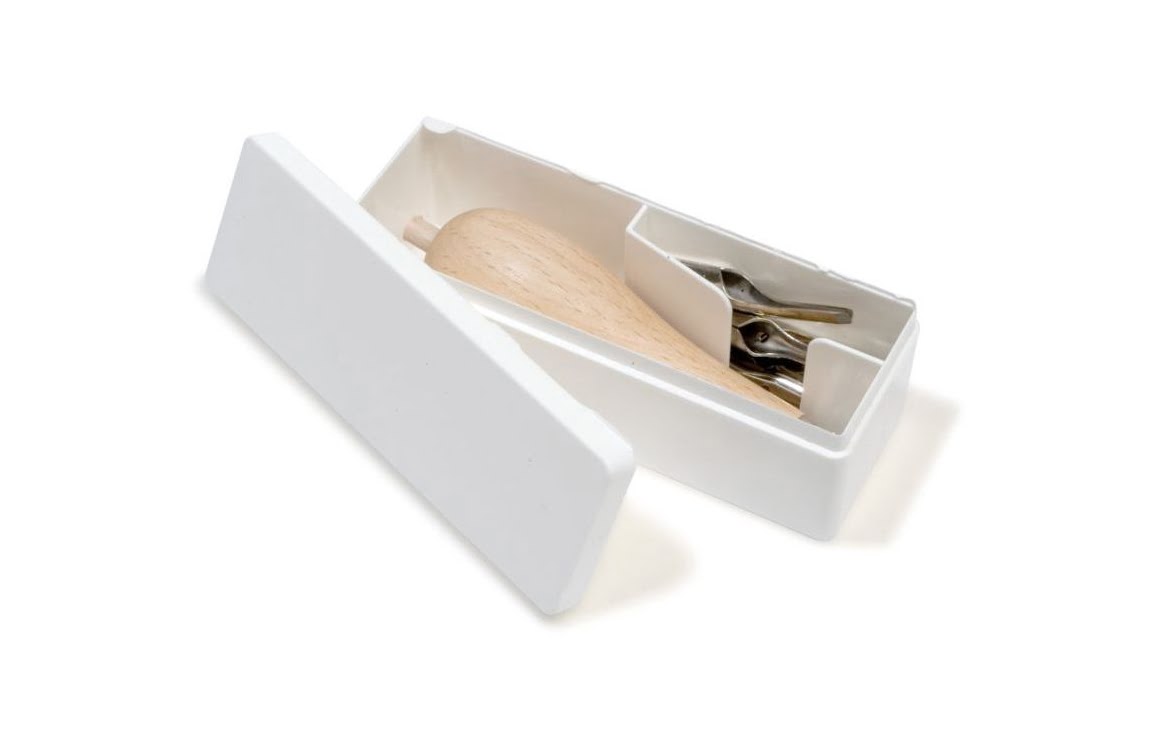 De Abig lino cutting set bevat een geronde houten handvat met een mes-verwijder-tool.