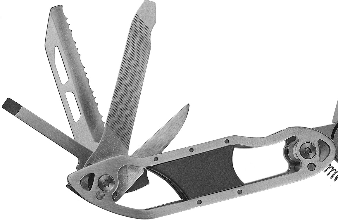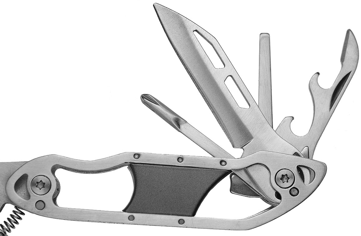 Een stevige tang, een gekarteld mes, een glad mes, een vijl, een platte schroevendraaier, een kruiskop schroevendraaier, een kabelknipper en een flesopener.